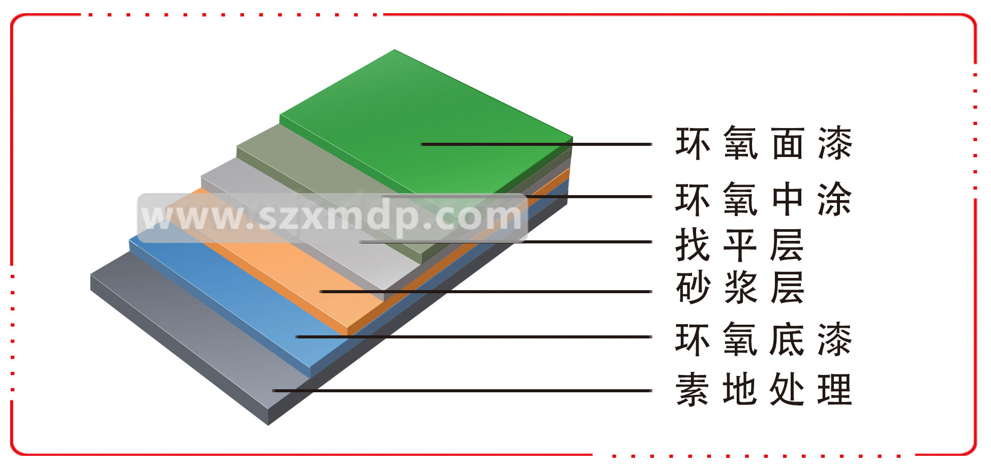 ![]() ◎ 選用無溶劑高級環(huán)氧樹脂加優(yōu)質(zhì)固化劑制成,無毒、無污染; ◎ 化學(xué)性能優(yōu)良,耐酸、堿、鹽、油類介質(zhì)腐蝕,特別耐強(qiáng)堿性能優(yōu); ◎ 平整光亮,可獲鏡面效果; ◎ 機(jī)械性能優(yōu)良,耐磨、耐壓、耐沖擊,有一定彈性; ◎ 施工快捷方便; ◎ 厚度2mm/8年,3mm/10年,4mm/12年,5mm/15年以上。 | ![]() 素地處理:打磨、吸塵處理: 底 涂:涂刷1-2遍環(huán)氧樹脂強(qiáng)滲透封閉底涂; 砂 漿 層:環(huán)氧樹脂中涂料調(diào)石英砂,用鏝刀或平刀抹刮,根據(jù)厚度要求可以多層施工; 找 平 層:再次打磨找平,進(jìn)行吸塵處理; 中 涂:批刮環(huán)氧樹脂中涂膩子層材料; 面 涂:用鏝刀將環(huán)氧樹脂自流平面漆鏝涂于中涂涂層之上 |