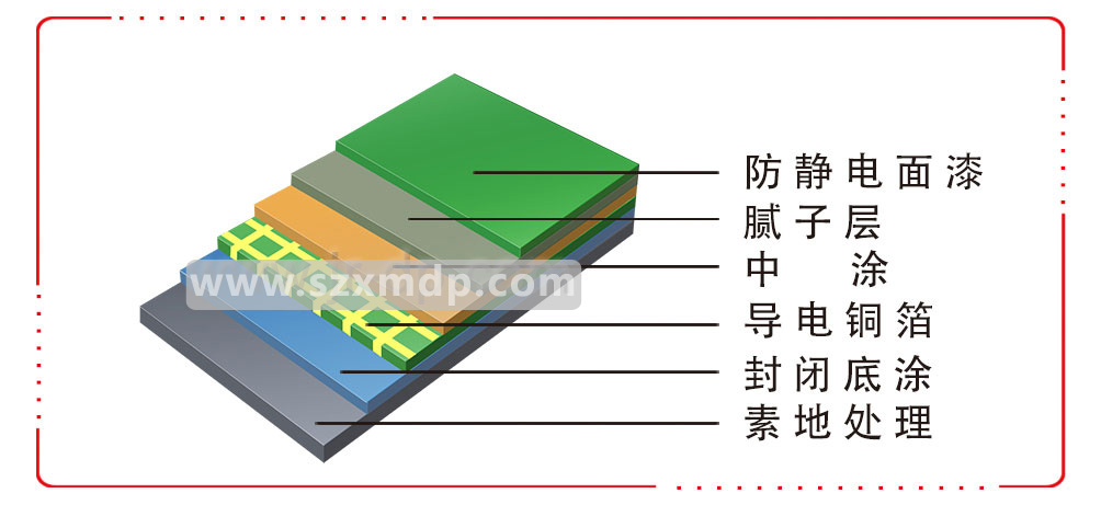 ![]() 素地處理:打磨、吸塵處理; 封閉底涂:涂刷1-2遍環氧樹脂防靜電底漆; 導電銅箔:按設計鋪設接地銅網; 中 涂:環氧樹脂防靜電中涂料平刮,配石英砂2-10倍,增加強度; 膩 子 層:打磨找平,吸塵處理,批刮環氧樹脂防靜電膩子層; 面 涂:用鏝刀將環氧樹脂防靜電自流平面漆鏝涂于合格的導靜電中涂涂層上。 | ![]() ◎ 擁有環氧樹脂地坪優異的機械和抗化學性能; ◎ 可快速排泄靜電電荷,表面電阻率達到105-109 Ω, 地面電阻排泄符合國際 GB6650-86A 標準; ◎ 表面電阻穩定持久,不受天氣濕度和表面磨損影響; ◎ 厚度1.0mm/5年,2.0mm/8年,3.0mm/10年。 |